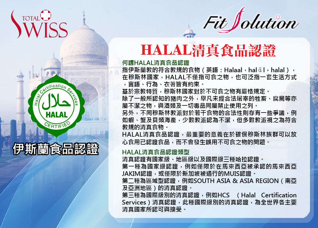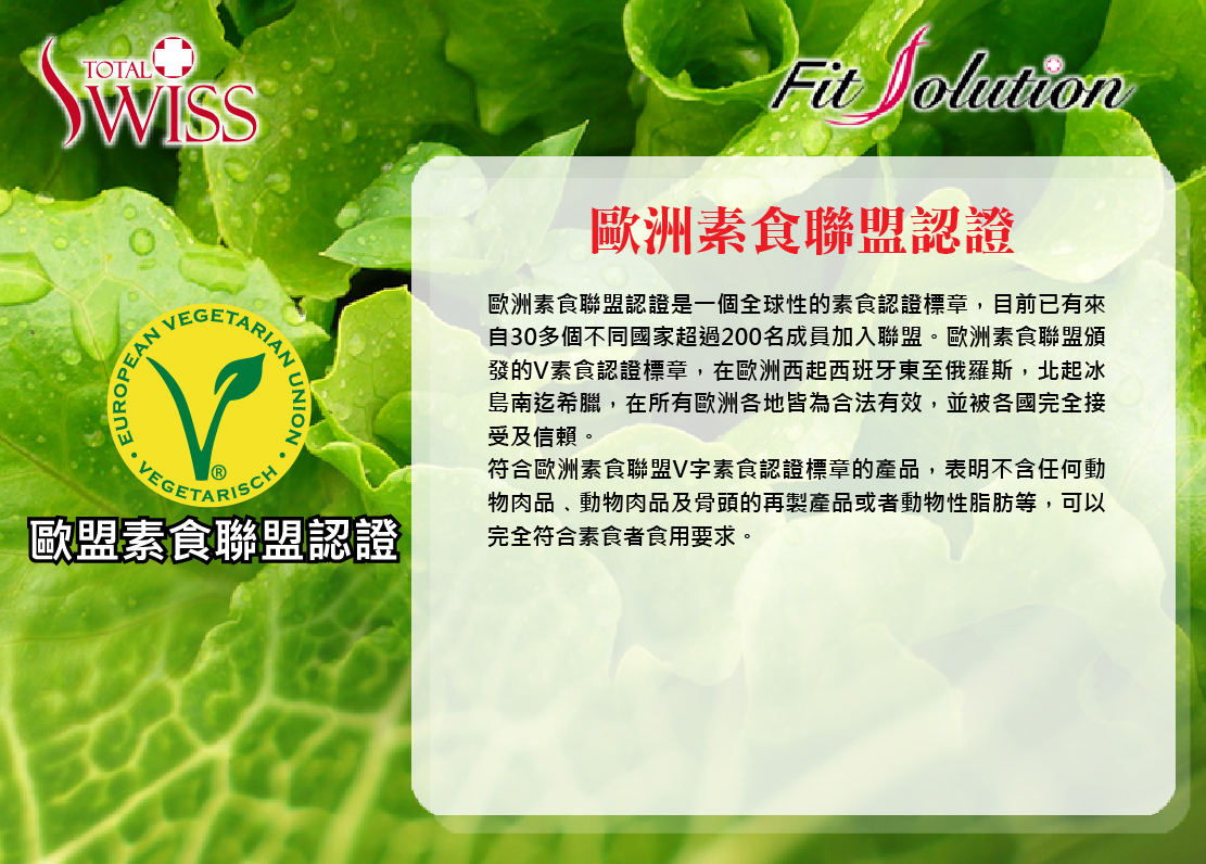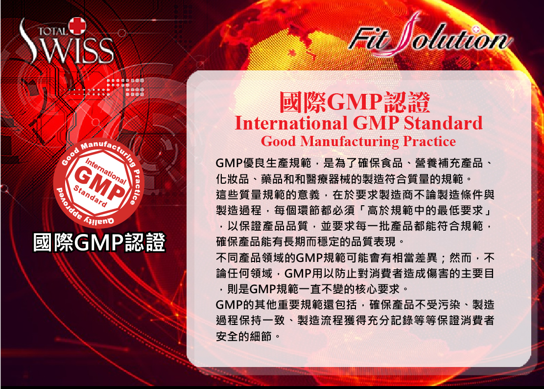截至目前為止,Total Swiss四大Solution系列產品,共計獲得國際GMP認證、瑞士洛桑認證、新加坡環保標章、HALAL清真食品認證、歐洲素食聯盟認證以及ISO、NSF等七大權威認證。