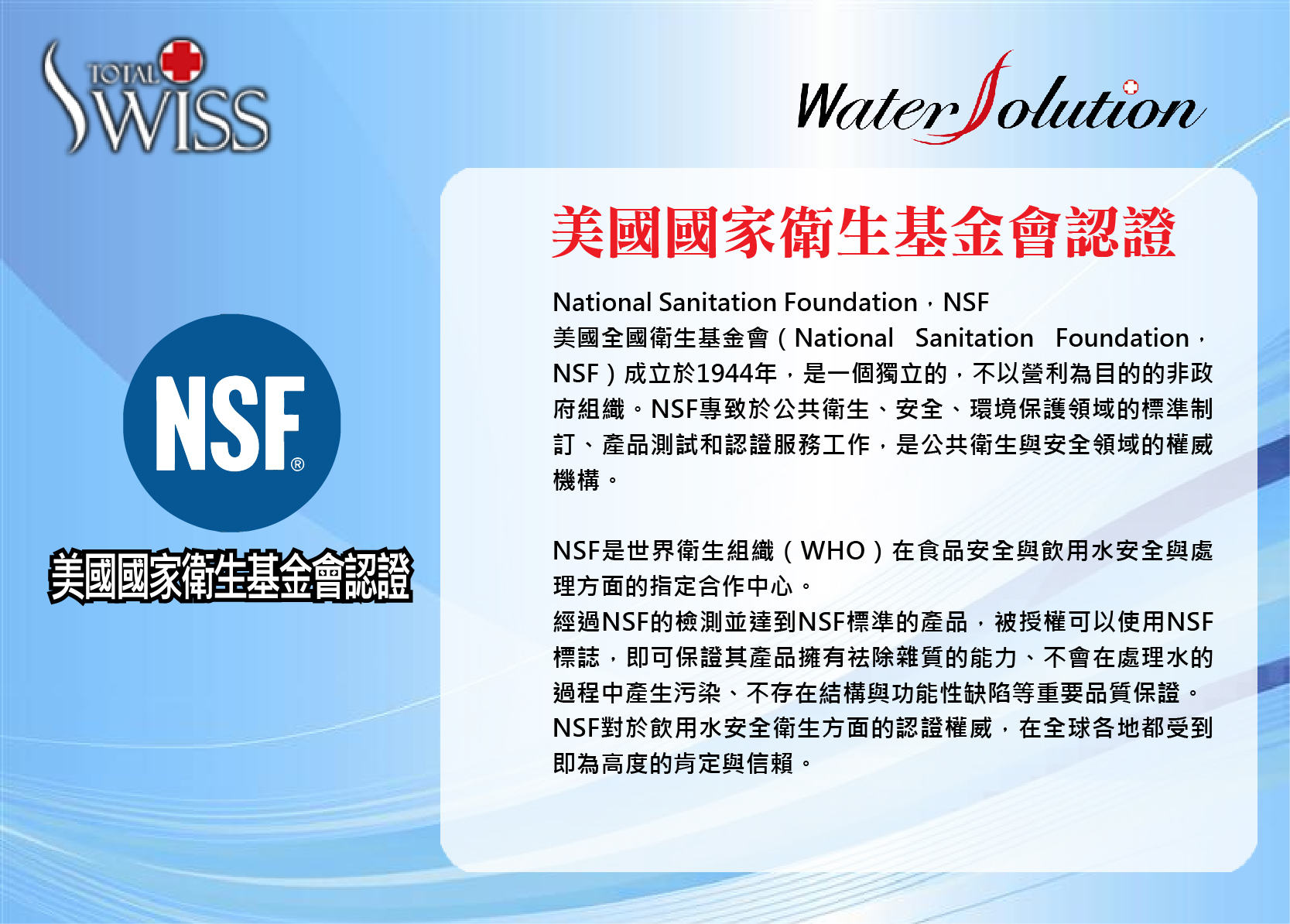 NSF對於飲用水安全衛生方面的認證權威,在全球各地都受到即為高度的肯定與信賴。